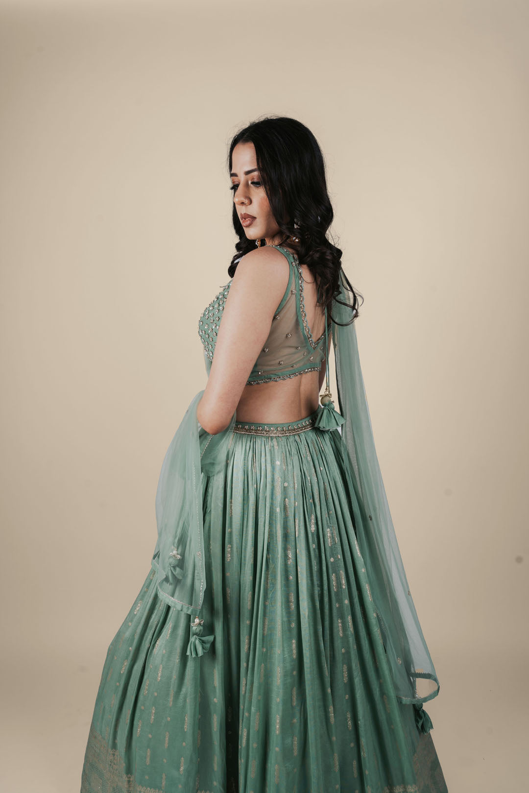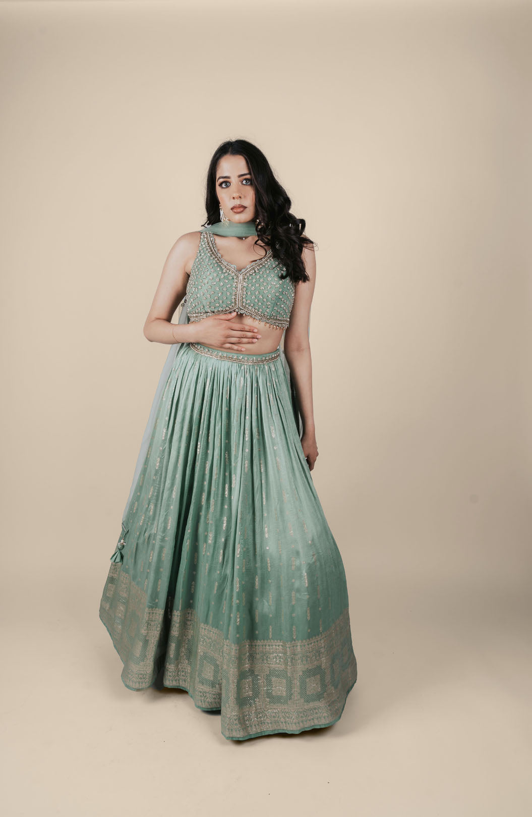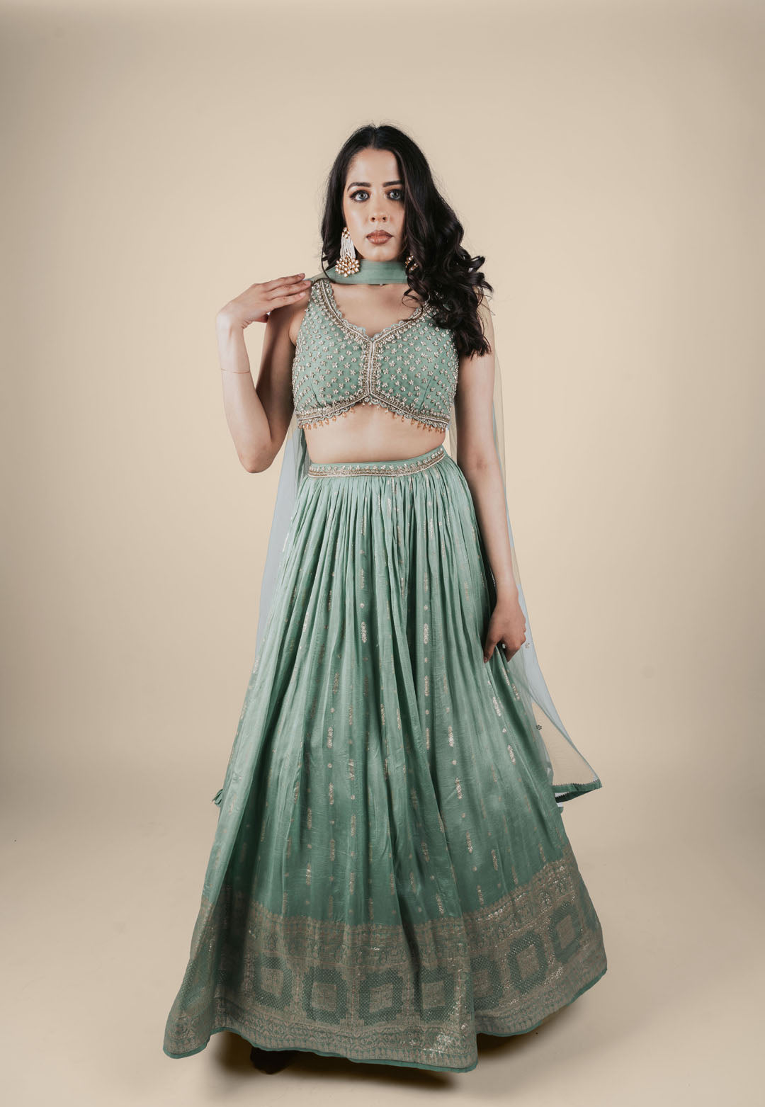 A silk jacquard lehenga with a golden touch to add the perfect shine and shimmer. This outfit is lightweight and comfortable so you can dance the night away!